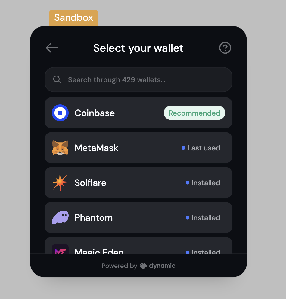 The Dynamic provided UI components include a New to Web3 help section as part of the DynamicWidget, where we show a common wallet for users to get started for each chain. You can easily recommend Coinbase Smart Wallet by adding the following to your DynamicContext settings: