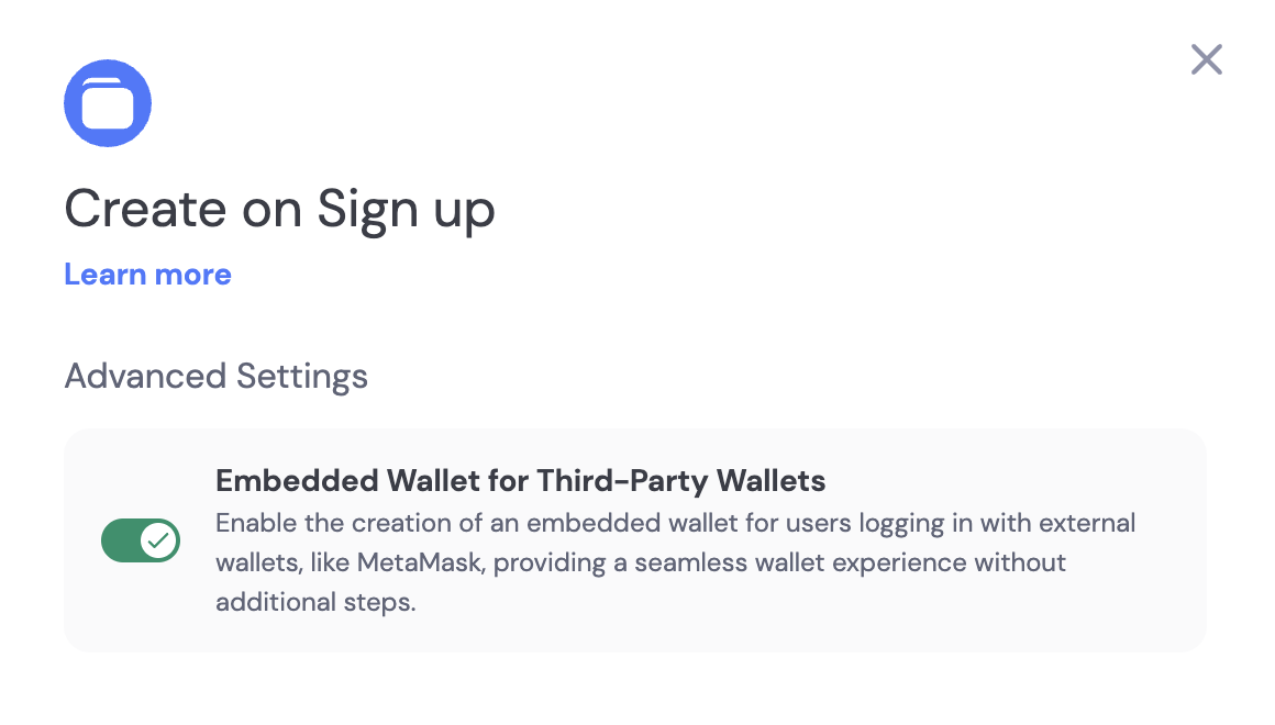 Embedded wallets can be automatically created for users signing in with external wallets, such as Metamask. To enable this feature, click the “Create on Sign up” card to expand the “Advanced Options” panel, and ensure the “Embedded Wallet for Third-Party Wallets” toggle is enabled.