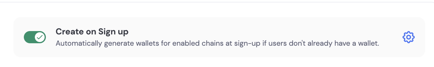 By default, embedded wallets are created automatically for users during sign-up if they don’t already have a wallet on the enabled chain. All you have to do is check that the “Create on Sign up” toggle is turned on in the Embedded Wallet configuration page.