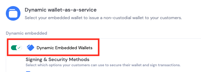 Go to the email, social & embedded wallet section of the dashboard, enable Dynamic-powered embedded wallets.