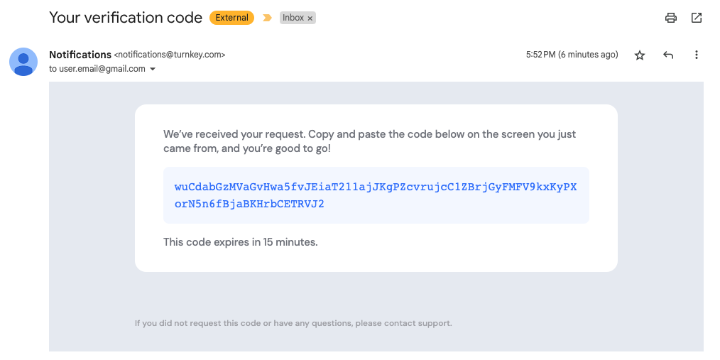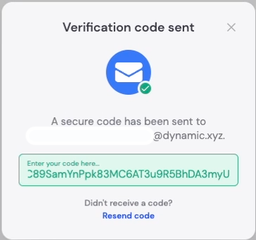 Using an authenticated email, Dynamic sends a secure one-time code (encoded in base65) at the time a transaction is initiated. This code must be pasted by the end-user and will grant them access to sign for transactions for their wallet. An encrypted key is stored in local storage based on a defined length of time (in the dashboard) so users can continue transacting without an additional prompt. One-time codes can also be combined with passkeys:- Users can utilize one-time codes for their initial transaction, and get prompted to add a passkey afterward.